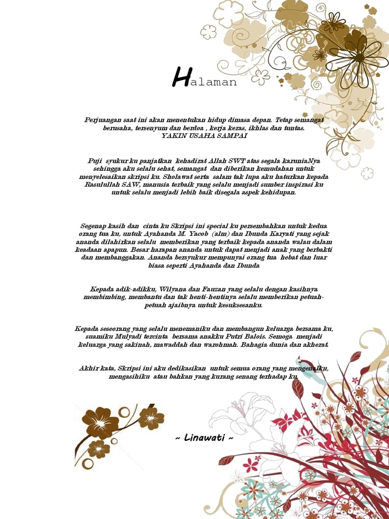 Contoh Isi Bahasa Lembar Persembahan Skripsi Yang Baik dan Benar 2014. Yang Tuhan turunkan untuk menjaga ku. Terima kasih juga untuk kedua orang tua.